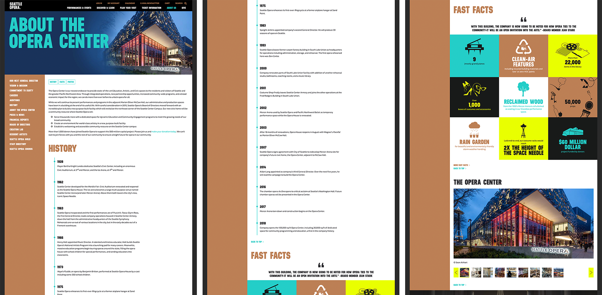 When Seattle Opera's Opera Center opened, I was tasked with designing and developing the layout for the new building's about page. This required me to present information in a engaging way while also being constrained by limitations of the page template's main content section.