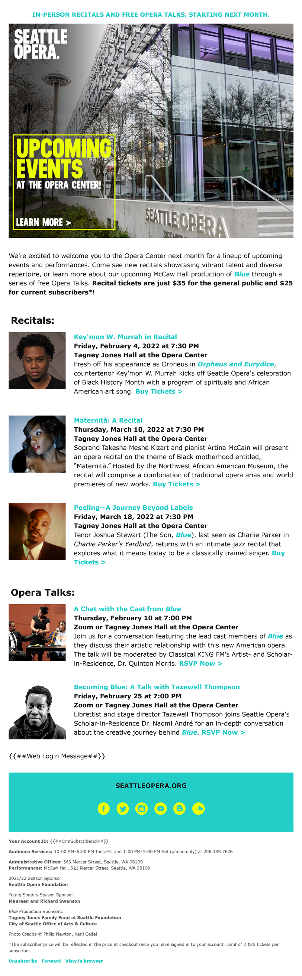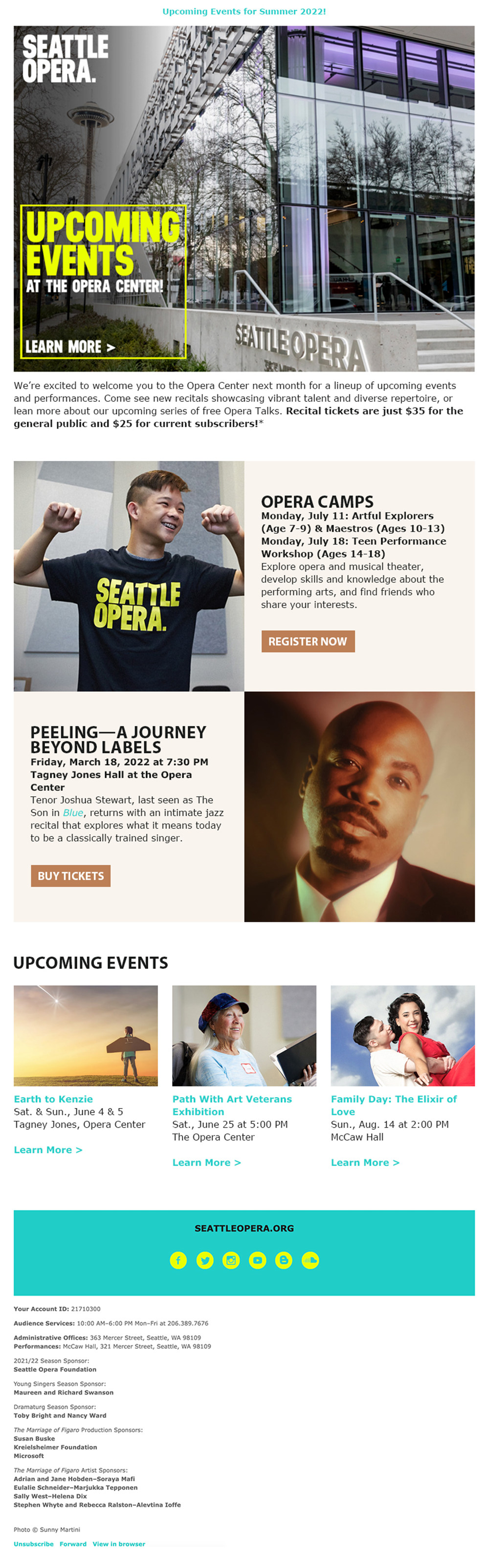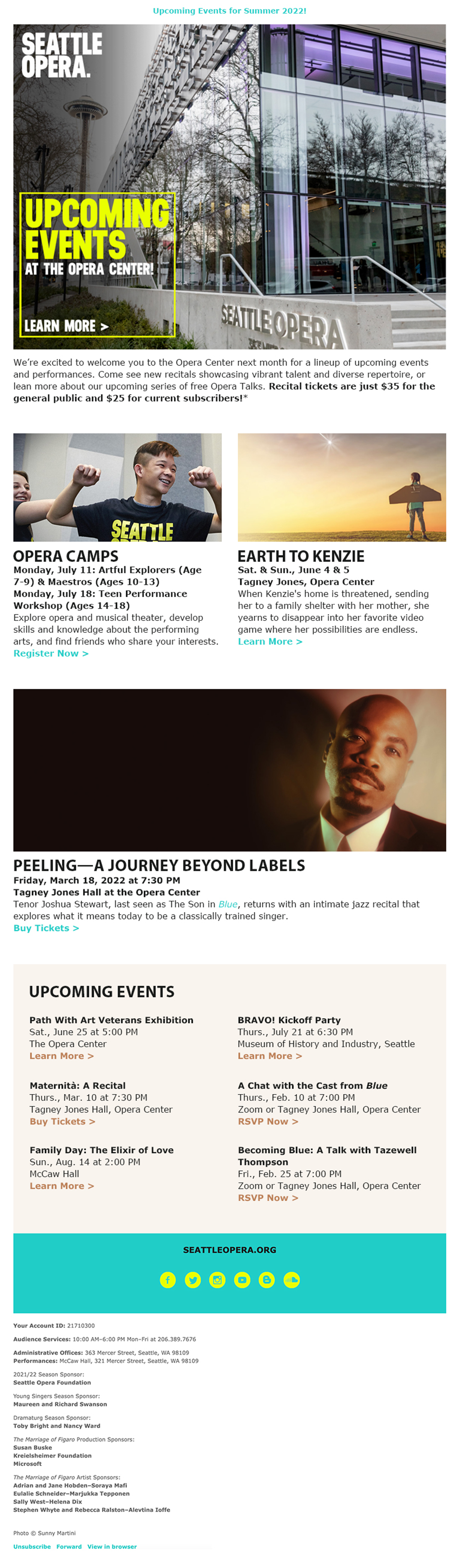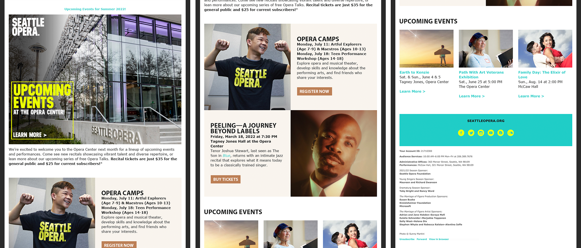 Seattle Opera asked me to redesign their Upcoming Events email newsletter because they were highlighting more community events, which made the original design too long and visually cluttered. Looking at the original design, I decided to break up the events with a visual hierarchy and incorporate the image-rich brand identity.